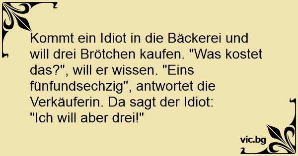Kommt ein Idiот in die Bäckerei und will drei Brötchen kaufen. "Was kostet das?", will er wissen. "Eins fünfundsechzig", antwortet die Verkäuferin. Da sagt der Idiот: