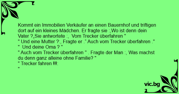 Kommt ein Immobilien Verkäufer an einen Bauernhof und triftigen dort auf ein kleines Mädchen. Er fragte sie :,Wo ist denn dein Vater ?„Sie antwortete :, Vom Trecker überfahren "