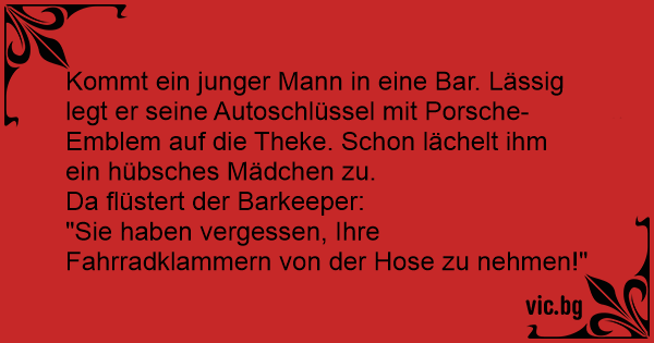 Kommt ein junger Mann in eine Bar. Lässig legt er seine Autoschlüssel mit Porsche-Emblem auf die Theke. Schon lächelt ihm ein hübsches Mädchen zu.