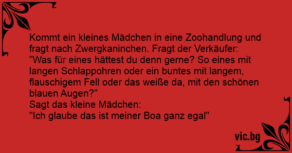 Kommt ein kleines Mädchen in eine Zoohandlung und fragt nach Zwergkaninchen. Fragt der Verkäufer: