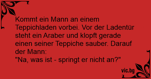 Kommt ein Mann an einem Teppichladen vorbei. Vor der Ladentür steht ein Araber und klopft gerade einen seiner Teppiche sauber. Darauf der Mann: