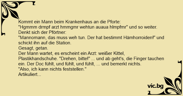 "Mannomann, das muss weh tun. Der hat bestimmt Hämhorroiden!" und schickt ihn auf die Station.
