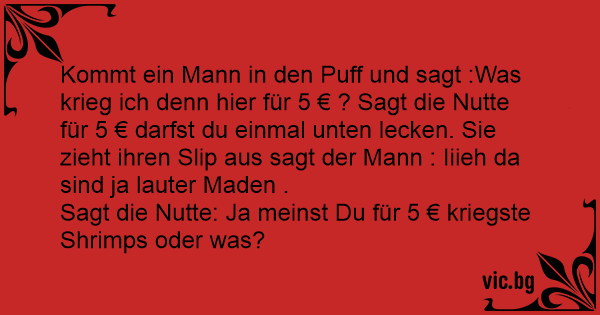 Kommt ein Mann in den Рuff und sagt :Was krieg ich denn hier für 5 € ? Sagt die Nuтте für 5 € darfst du einmal unten lecken. Sie zieht ihren Slip aus sagt der Mann : Iiieh da sind ja lauter Maden .