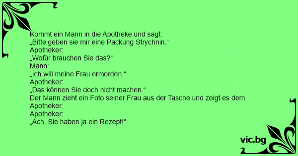 Kommt ein Mann in die Apotheke und verlangt 50 Gramm Arsen. Fragt der Verkäufer: "Haben Sie dafür ein Rezept?" "Nein, aber ein Bild von meiner Schwiegermutter..."
