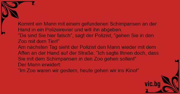 Am nächsten Tag sieht der Polizist den Mann wieder mit dem Affen an der Hand auf der Straße. “Ich sagte Ihnen doch, dass Sie mit dem Schimpansen in den Zoo gehen sollen!”