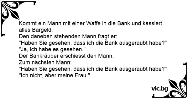 A bank robber wanted to keep his identity secret, but didn't wear a balaclava. He told all in the bank not to look at him or he would shoot them. One foolhardy customer sneaked a look, and the robber promtply shot him. The robber asked if anyone else had seen his face. One customer, gazing...