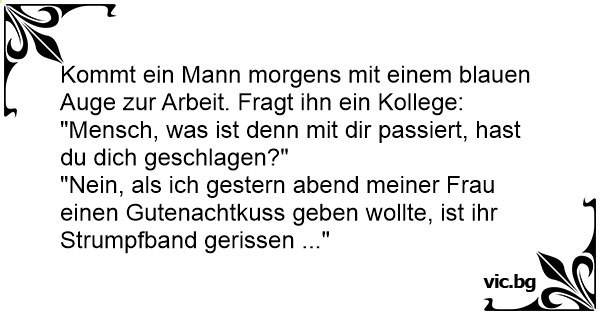 Kommt ein Mann morgens mit einem blauen Auge zur Arbeit. Fragt ihn ein Kollege: