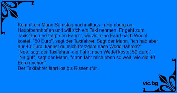 Kommt ein Mann Samstag nachmittags in Hamburg am Hauptbahnhof an und will sich ein Taxi nehmen. Er geht zum Taxistand und fragt den Fahrer, wieviel eine Fahrt nach Wedel kostet. "50 Euro", sagt der Taxifahrer. Sagt der Mann, "ich hab aber nur 40 Euro, kannst du mich trotzdem nach Wedel fahren?"
