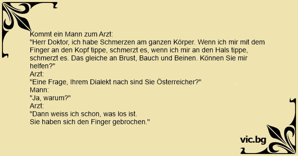 "Herr Doktor, wenn ich auf den Kopf drücke, tut´s weh, wenn ich auf´s Bein drücke, tut´s weh, wenn ich auf den Bauch drücke, tut´s weh, und wenn ich auf den Arm drücke, tut´s auch weh." "Ja, da...