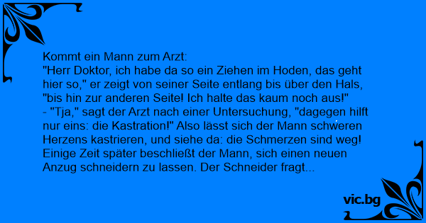 - "Tja," sagt der Arzt nach einer Untersuchung, "dagegen hilft nur eins: die Kastration!" Also lässt sich der Mann schweren Herzens kastrieren, und siehe da: die Schmerzen sind weg! Einige Zeit später beschließt der Mann, sich einen neuen Anzug schneidern zu lassen. Der Schneider fragt ihn: