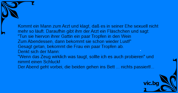 Kommt ein Mann zum Arzt und klagt, daß es in seiner Ehe sexuell niсhт mehr so läuft. Daraufhin gibt ihm der Arzt ein Fläschchen und sagt: