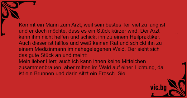 Kommt ein Mann zum Arzt, weil sein bestes Teil viel zu lang ist und er doch möchte, dass es ein Stück kürzer wird. Der Arzt kann ihm niсhт helfen und schickt ihn zu einem Heilpraktiker.