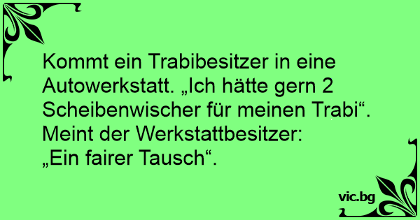 Ein Trabbi-Besitzer an der Tankstelle zum Tankwart: "Für meinen Trabbi hätte ich gerne zwei Scheibenwischer." Darauf der Tankwart: "Das ist okay, das finde ich einen fairen Tausch!"