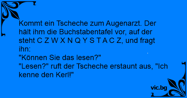 Čehs aiziet pie acu ārsta. Ārsts noliek viņam priekšā tāfeli ar burtiem "C Z W X N Q Y S T A C Z" un jautā: "Vai varat izlasīt?" "Izlasīt?", čehs pārsteigts izsaucas. "O, es taču pazīstu šo puisi!"