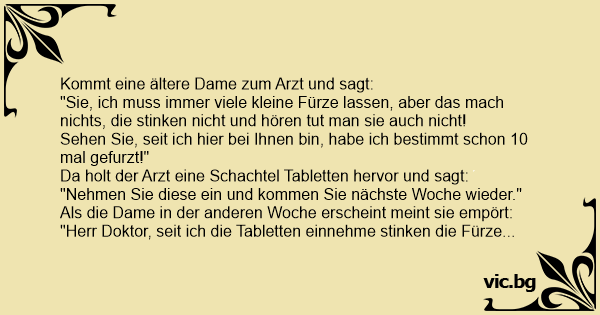 "Herr Doktor, seit ich die Tabletten einnehme stinken die Fürze ja fürchterlich!"