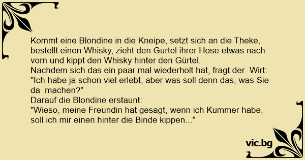 Kommt eine Blondine in die Kneipe, setzt sich an die Theke, bestellt einen Whisky, zieht den Gürtel ihrer Hose etwas nach vorn und kippt den Whisky hinter den Gürtel.