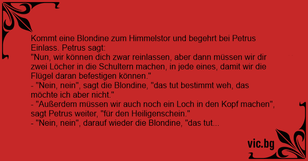 Блондинка стои пред входа на Рая, а Свети Петър и преглежда документите, да види дали е за там. Докато прелиства, се чува ужасяващ вик отвън... Блондинката притеснено пита: