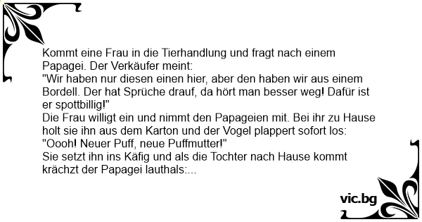 Папагал Der Papagei aus dem Puff Нахлува НСБОП в столичен бардак. Une maman décide d’acheter un animal de compagnie à ses deux filles. Frau Maier begibt sich in eine Tierhandlung und erblickt dort einen prächtigen Papagei. Една жена влязла в зоомагазин и видяла един много красив папагал. Продавачката побързала да обясни: Жена в зоомагазин: Един бардак фалирал и от него останал един папагал. Семья купила попугая, их предупредили, что он жил в борделе. Дома дочь скинула накидку с него, он тут же кричит: Ήταν κάποτε ένα παιδί και ήθελε να πάρει ένα παπαγάλο, και μάζευε λεφτά. Kάποια στιγμή ανοίγει τον κουμπάρα του, βρίσκει τριάντα ευρώ. Πάει στο κατάστημα με τα κατοικίδια και λέει: Μπαίνει η Χίλλαρυ Κλίντον σ ένα μαγαζί για ζώα. (Σιγά, ρε παιδιά, μη Josiane, mère de famille, se balade en ville lorsqu'elle passe devant une animalerie qui vend un perroquet seulement 50 €. Elle décide de rentrer et demande pourquoi il est si peu cher. La dame lui répond qu'ayant vécu dans une maison de passe il a un language un peu bizarre. Le prix étant... Uma senhora está farta de ficar sozinha a maioria do tempo e, procurando por companhia, resolve comprar um papagaio. Então ela entra em uma loja e pergunta o preço do animal, quando o dono da loja diz: — Olha, eu tenho esse papagaio aqui e lhe vendo por 20 reais! Ela fica feliz com o preço e... The Clintons took a break and went to Camp David for 10 days. While away, George Stephanapolis cared for the First Parrot. The pet parrot is not public knowledge because it has a fowl mouth. (Yes, that pun was certainly intended). George got irked... Un jour une femme décide d'acheter un perroquet à ses filles. Elle se rend donc au magasin d'animaux le plus près. Arrivée là, elle voit une aubaine pas croyable : 200 $ pour un magnifique... En dam kommer in i en zoo-affär för att köpa ett djur till sina döttrar. Efter att ha gått runt och tittat bestämmer hon sig för en papegoja. Expediten säger att den tidigare bott på en bordell och... Een hoerekot gaat failliet en de hele inboedel, waaronder een prachtige papegaai, wordt geveild. Een dame, vindt het echt zo'n prachtige papegaai, dat ze hem moet kopen, hij is ook helemaal niet... Жена си купила папагал от разпродажба на имуществото на публичен дом. Занесла го вкъщи и го сложила в гостната. Когато дъщерята се прибрала от училище, папагалът закрещял с все сила: - Нови к*урви... En kvinna köpte en talande papegoja. Expediten i djuraffären varnade henne att fågeln kom direkt ifrån en bordell och hade ett mycket speciellt ordförråd. Kvinnan var inte det minsta pryd, så hon... A menina tanto pedira que o pai, no dia do seu aniversário, comprou-lhe um papagaio, mal sabendo que a sua proveniência era de um famoso bordel da cidade.Depois de apagar as velinhas, todos os... Pewna kobieta przechodziła obok domu publicznego, gdzie odbywała się wyprzedaż sprzętów. Kupiła papugę w klatce, przyniosła ją do domu. Klatka była przykryta płachtą, która kobieta podniosła. - O,... En dam kliver in i en zooaffär, får syn på en papegoja och blir genast förtjust i fågeln. – Ursäkta, kan papegojan prata och är den till salu? frågar hon. – Jadå, den både pratar och är till salu.... Een deftige dame wil graag een papagaai kopen. Nu staat er één in de krant te koop bij een sexclub. Zij erheen en koopt hem direct. Hij is mooi, lief en kan praten. 's Middags tijdens haar... Une femme va acheter un perroquet. Les prix sont de 100€, 200€ et 15€. Elle demande pourquoi le dernier et si peu chère par rapport au autres. - « C'est parce qu'il vivait dans un bordel » lui... Femeia merge in piata de animale. Vrea sa faca O suprinza sotului. - Buna ziua, doamna! - Buna ziua, as dori un papagal. - Din pacate, doar un singur papagal avem. Adevarat ca pina acum a trait la...