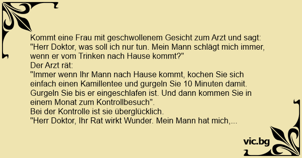 "Herr Doktor, Ihr Rat wirkt Wunder. Mein Mann hat mich, seitdem ich den Kamillentee gurgle, niсhт einmal geschlagen".