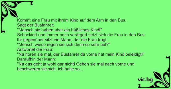 En dame går på bussen med babyen sin, da bussjåføren utbryter: - «Det er den styggeste babyen jeg noen gang har sett. Æsj!» Damen går bak i bussen, setter seg ned og er rasende. «Sjåføren fornærmet...