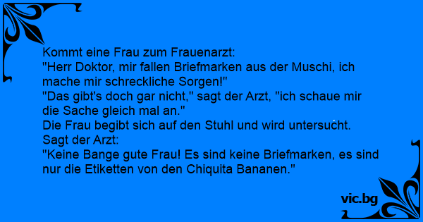 „Herr Dr., aus meiner Vagina kommen Briefmarken aus Costa Rica.“ „Ähm Nee, das sind Aufkleber von Bananen.“