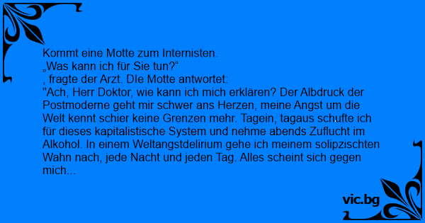 Kommt eine Motte zum Internisten. „Was kann ich für Sie tun?“ , fragte der Arzt. DIe Motte antwortet: "Ach, Herr Doktor, wie kann ich mich erklären? Der Albdruck der Postmoderne geht mir schwer ans Herzen, meine Angst um die Welt kennt schier keine Grenzen mehr. Tagein, tagaus schufte ich für dieses kapitalistische System und nehme abends Zuflucht im Alkohol. In einem Weltangstdelirium gehe ich meinem solipzischten Wahn nach, jede Nacht und jeden Tag. Alles scheint sich gegen mich verschworen zu haben. Ich fühle mich schuldig für die ganzen Kriege in der Welt. Was können wir nur tun gegen das Schlimme, das so brutal in unsere Welt hereingebrochen ist? Ich bin verwirrt, nein die Welt ist verworren, alles ist so kompliziert geworden. Nachts wache ich schweißgebadet auf und denke an Nordkorea." Darauf der Arzt: "Ich bin Internist, aber sie sollten eigentlich einen Psychiater oder Psychologen aufsuchen. Wieso sind SIe zu mir gekommen?" Darauf antwortet die Motte: „Weil das Licht an war.“