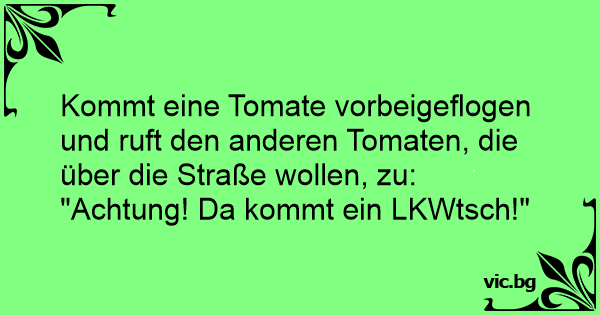 Kommt eine Tomate vorbeigeflogen und ruft den anderen Tomaten, die über die Straße wollen, zu: