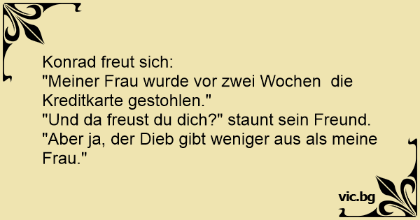 Die Polizei fragt einen Mann: Warum haben Sie Ihre Kreditkarte nicht gemeldet, als sie Ihnen gestohlen wurde? Der Mann antwortet: Der Dieb hat weniger ausgegeben als meine Frau. Daraufhin die Polizei: Und warum melden Sie es jetzt erst? Der Mann: Ich...