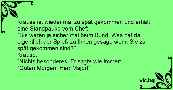 Der Student erscheint zu spät zur Vorlesung. Der Professor pflaumt ihn darauf hin an. "Haben Sie gedient?" "Habe ich!" "Und was hat Ihr Spieß gesagt, wenn Sie zu spät gekommen sind?" "Guten Morgen,...