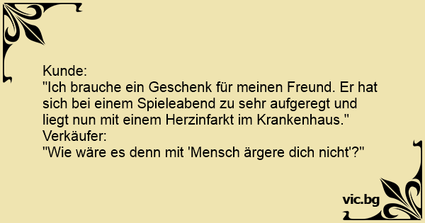 "Ich brauche ein Geschenk für meinen Freund. Er hat sich bei einem Spieleabend zu sehr aufgeregt und liegt nun mit einem Herzinfarkt im Krankenhaus."