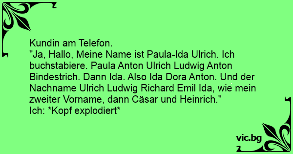 "Ja, Hallo, Meine Name ist Paula-Ida Ulrich. Ich buchstabiere. Paula Anton Ulrich Ludwig Anton Bindestrich. Dann Ida. Also Ida Dora Anton. Und der Nachname Ulrich Ludwig Richard Emil Ida, wie mein zweiter Vorname, dann Cäsar und Heinrich."