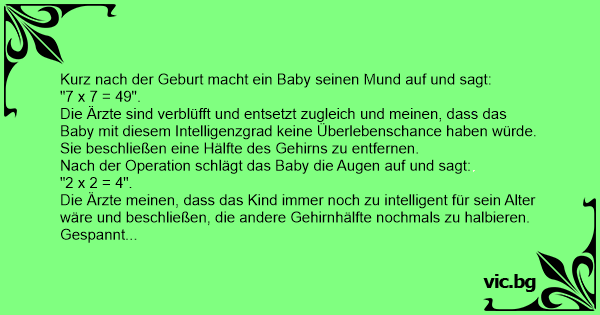 Минава доктора на визитация и като минава през стаята с новородените бебета едно от бебетата се надига и му вика: - Докторе едно шахче? Гледа го доктора и си вика - абе това е едно новородено ще го бия, но - доктора на втория ход е мат. Доктора си мисли: - Абе това бебе е много умно като...
