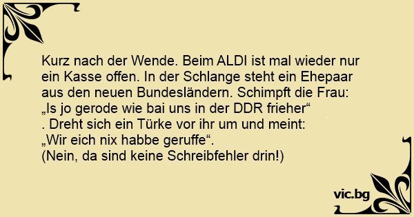 Kurz nach der Wende. Beim ALDI ist mal wieder nur ein Kasse offen. In der Schlange steht ein Ehepaar aus den neuen Bundesländern. Schimpft die Frau: