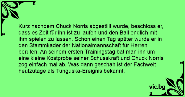 Kurz nachdem Chuck Norris abgestillt wurde, beschloss er, dass es Zeit für ihn ist zu laufen und den Ball endlich mit ihm spielen zu lassen. Schon einen Tag später wurde er in den Stammkader der Nationalmannschaft für Herren berufen. An seinem ersten Trainingstag bat man ihn um eine kleine Kostprobe seiner Schusskraft und Chuck Norris zog einfach mal ab. Was dann geschah ist der Fachwelt heutzutage als Tunguska-Ereignis bekannt.