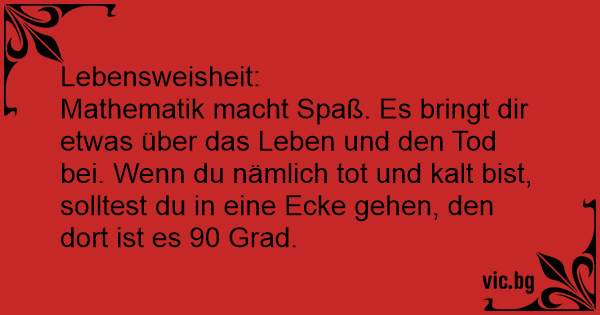 Mathematik macht Spaß. Es bringt dir etwas über das Leben und den Tod bei. Wenn du nämlich tot und kalt bist, solltest du in eine Ecke gehen, den dort ist es 90 Grad.