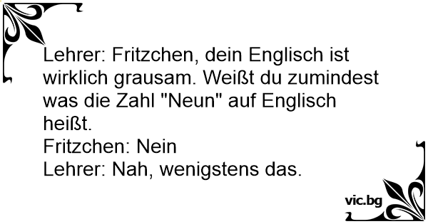 Lehrer: Fritzchen, dein Englisch ist wirklich grausam. Weißt du zumindest was die Zahl "Neun" auf Englisch heißt.