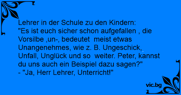"Es ist euch sicher schon aufgefallen , die Vorsilbe ‚un-‚ bedeutet meist etwas Unangenehmes, wie z. B. Ungeschick, Unfall, Unglück und so weiter. Peter, kannst du uns auch ein Beispiel dazu sagen?"