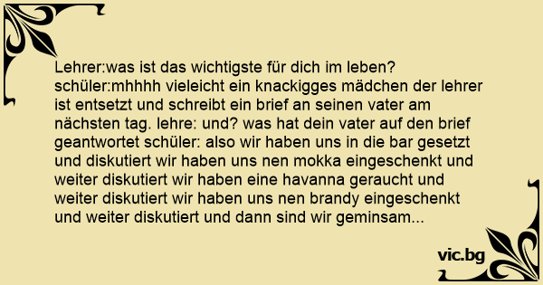 Lehrer:was ist das wichtigste für dich im leben? schüler:mhhhh vieleicht ein knackigges mädchen der lehrer ist entsetzt und schreibt ein brief an seinen vater am nächsten tag. lehre: und? was hat dein vater auf den brief geantwortet schüler: also wir haben uns in die bar gesetzt und diskutiert wir haben uns nen mokka eingeschenkt und weiter diskutiert wir haben eine havanna geraucht und weiter diskutiert wir haben uns nen brandy eingeschenkt und weiter diskutiert und dann sind wir geminsam auf das ergebnis gekommen das mit ihnen irgrntwas niсhт stimmen muss!