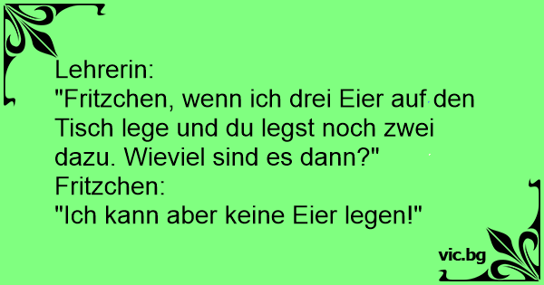 "Fritzchen, wenn ich drei Eier auf den Tisch lege und du legst noch zwei dazu. Wieviel sind es dann?"