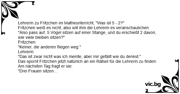 Eine Lehrerin beschließt die Intelligenz ihrer Schüler zu testen. Sie fragt Fritzchen: Wenn auf einem Zaun zwei Vögel sitzen, und ich schieße zweimal, wie viele sind dann tot? Fritzchen: Einer. Die...