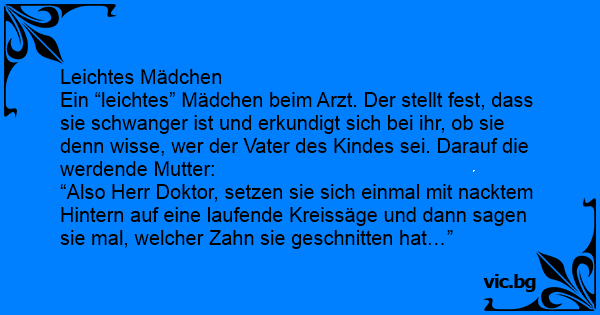 Ein “leichtes” Mädchen beim Arzt. Der stellt fest, dass sie schwanger ist und erkundigt sich bei ihr, ob sie denn wisse, wer der Vater des Kindes sei. Darauf die werdende Mutter: