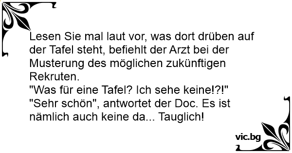Lesen Sie mal laut vor, was dort drüben auf der Tafel steht, befiehlt der Arzt bei der Musterung des möglichen zukünftigen Rekruten.