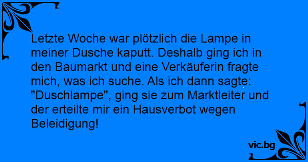Letzte Woche war plötzlich die Lampe in meiner Dusche kaputt. Deshalb ging ich in den Baumarkt und eine Verkäuferin fragte mich, was ich suche. Als ich dann sagte: