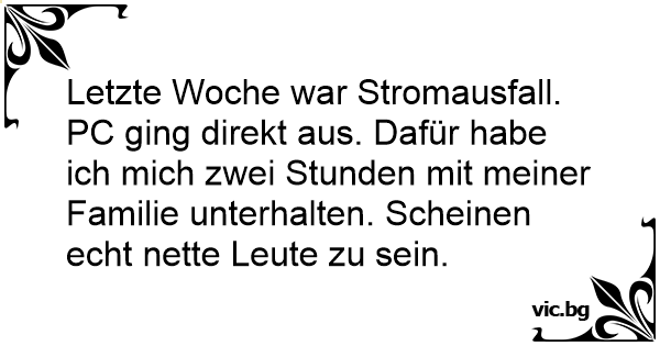 Letzte Woche war Stromausfall. PC ging direkt aus. Dafür habe ich mich zwei Stunden mit meiner Familie unterhalten. Scheinen echt nette Leute zu sein.
