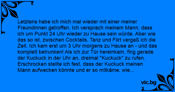 Letztens habe ich mich mal wieder mit einer meiner Freundinnen getroffen. Ich versprach meinem Mann, dass ich um Punkt 24 Uhr wieder zu Hause sein würde. Aber wie das so ist, zwischen Cocktails, Tanz und Flirt vergaß ich die Zeit. Ich kam erst um 3 Uhr morgens zu Hause an - und das komplett betrunken! Als ich zur Tür hereinkam, fing gerade der Kuckuck in der Uhr an, dreimal "Kuckuck" zu rufen. Erschrocken stellte ich fest, dass der Kuckuck meinen Mann aufwecken könnte und er so mitkäme, wie spät es ist. Also fing ich an, neun weitere Male "Kuckuck" zu rufen. Zufrieden und stolz, in meinem Zustand noch einen so guten Einfall gehabt zu haben, begab ich mich ins Schlafzimmer. Ich legte mich ins Bett und war beruhigt dank meines schlauen Einfalls. Am nächsten Morgen beim Frühstück fragte mich mein Mann, wann ich denn letzte Nacht zu Hause angekommen sei. Ich sagte total unschuldig: