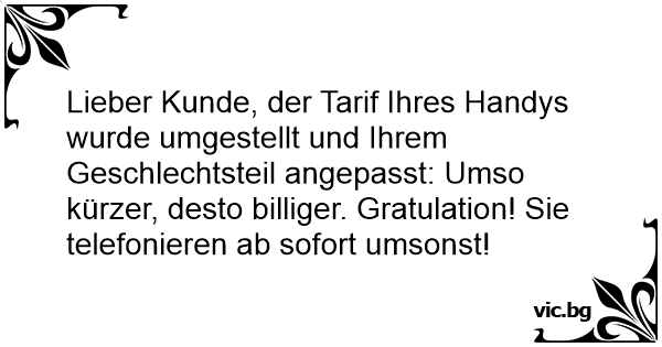 Lieber Kunde, der Tarif Ihres Handys wurde umgestellt und Ihrem Geschlechtsteil angepasst: Umso kürzer, desto billiger. Gratulation! Sie telefonieren ab sofort umsonst!