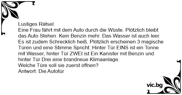 Eine Frau fährt mit dem Auto durch die Wüste. Plötzlich bleibt das Auto Stehen. Kein Benzin mehr. Das Wasser ist auch leer. Es ist zudem Schrecklich heiß. Plötzlich erscheinen 3 magische Türen und eine Stimme Spricht: Hinter Tür EINS ist ein Tonne mit Wasser, hinter Tür ZWEI ist Ein Kanister mit Benzin und hinter Tür Drei eine brandneue Klimaanlage.