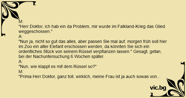 "Herr Doktor, ich hab ein da Problem, mir wurde im Falkland-Krieg das Glied weggeschossen."