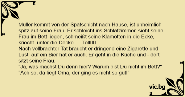 Müller kommt von der Spätschicht nach Hause, ist unheimlich spitz auf seine Frau. Er schleicht ins Schlafzimmer, sieht seine Frau im Bett liegen, schmeißt seine Klamotten in die Ecke, kriecht unter die Decke..... Toll!!!!