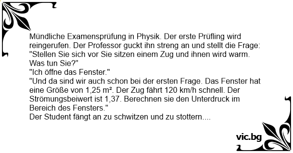 Politechnika. Egzamin z fizyki. Profesor, który wstał lewą nogą zaczyna pytać pierwszego delikwenta: - Jedzie pan autobusem i jest straszliwie gorąco. Co pan zrobi? - Otworzę okno. - Bardzo dobrze...